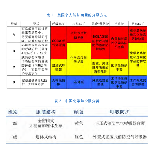 國內(nèi)標(biāo)準(zhǔn)GA 770-2008《 消防員化學(xué)防護(hù)服》中參考了USA的標(biāo)準(zhǔn),對化學(xué)防護(hù)服的分類標(biāo)準(zhǔn)進(jìn)行了簡化,如表2所示。我國的一級防護(hù)裝備等同于USA的A級防護(hù),二級就是A級以下的防護(hù)裝備了。