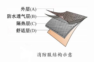 消防服由外層(A )、防 透 氣 層 (B )、隔熱層 (C)、舒適層(D)等層復合而成。阻燃性是外層 的基本要求;防透氣層的作用主要是防或有害物質滲入,并將人體產生的汗液和濕氣及時排出;隔熱層要求具備良好的隔熱、防熱輻射性;舒適層提供與人體接觸的舒適性。多層織物復合形成消防服,需提供的主要性能是整體熱防護性、透水蒸氣性和舒適性。