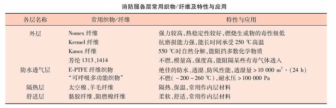 消防服的常用材料:對位芳香族聚酰胺纖維、高強高模的聚乙烯纖維、拒油的含氟化合物、抗輻射的聚酰亞胺纖維、抗靜電集聚的腈綸絡合銅纖維等。