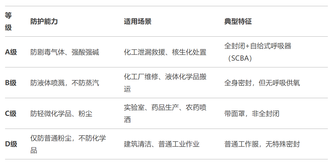 防護(hù)服等級(jí)通常按防護(hù)能力劃分,主要參考OSHA(美國(guó)職業(yè)安全健康局)和EN 143(歐盟標(biāo)準(zhǔn)),分為A、B、C、D四個(gè)等級(jí),防護(hù)能力依次降低。
